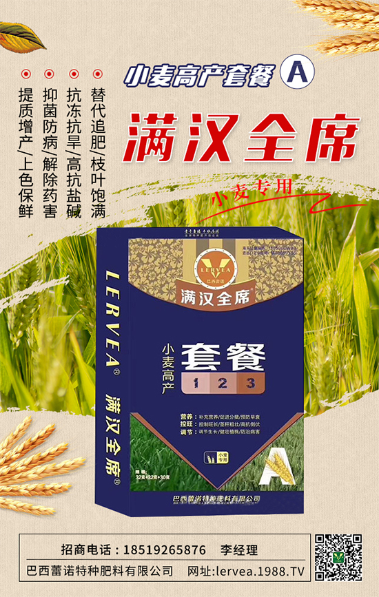 3、抓住小麥返青拔節(jié)的有利時(shí)機(jī),及時(shí)采取促控措施,促進(jìn)弱苗轉(zhuǎn)化,提高成穗率;控制旺長田塊,預(yù)防后期貪青倒伏。今天,小編為大家?guī)硪豢畎臀骼僦Z特種肥料有限公司的產(chǎn)品--小麥高產(chǎn)套餐A,能夠補(bǔ)充小麥生長的各種營養(yǎng)、調(diào)節(jié)小麥長勢,提高小麥抗病能力,為小麥高產(chǎn)保駕護(hù)航!