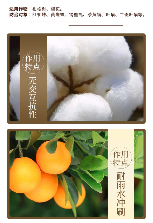 防治對象∶紅蜘蛛、黃蜘蛛、銹壁虱、茶黃螨、葉螨、二斑葉螨等。