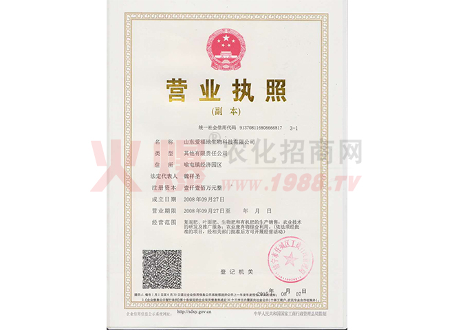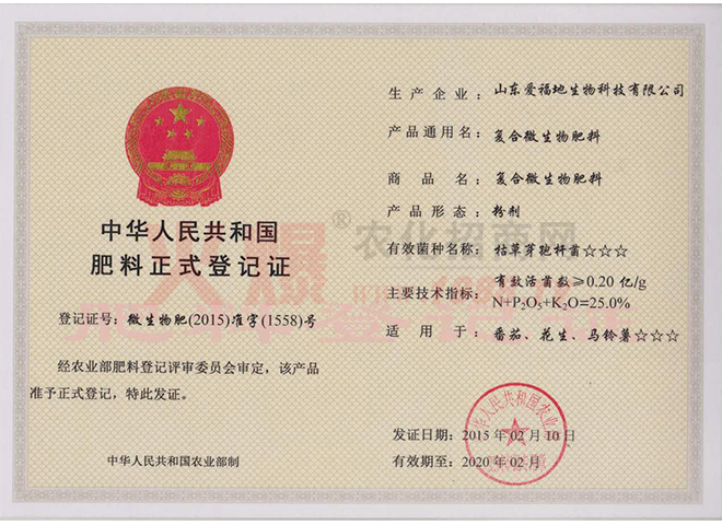 證書名稱:肥料正式登記證 發(fā)證機構:中華人民共和國農(nóng)業(yè)部